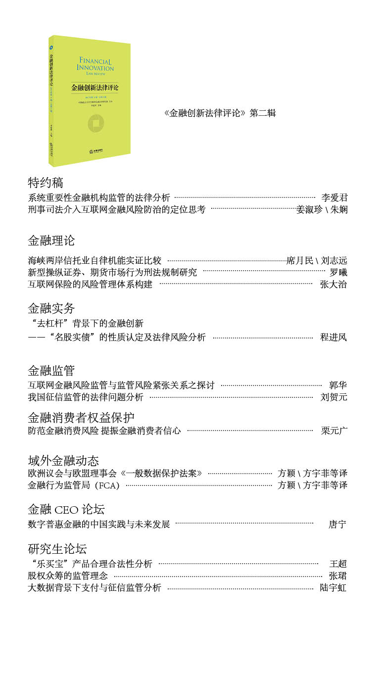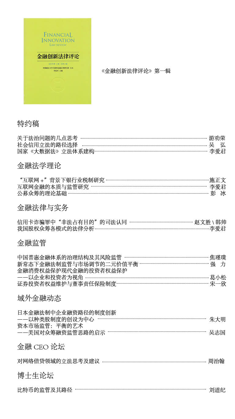 在核心期刊、海外学术刊物发表《系统重要性金融监管的特殊风险法律防范》《互联网金融本质与监管》